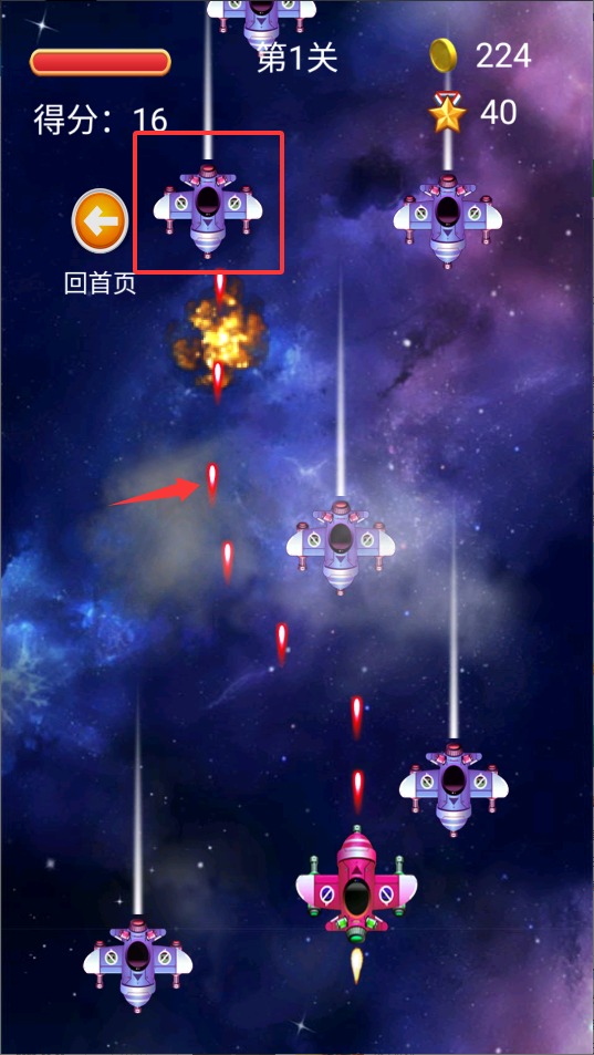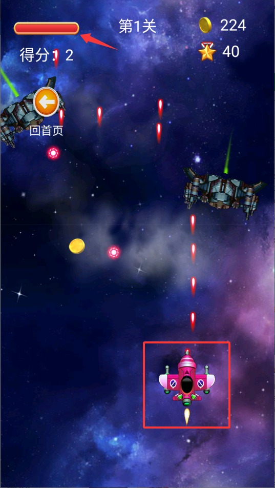 2、手指在屏幕任意位置滑动即可操控战机移动,注意闪避红色预警区域,这是敌方即将发动攻击的危险信号。