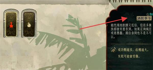 2、收益风险机制:「狩猫毙贼」无失败惩罚,「酒馆拳斗、黑吃黑」失败有负面(受伤、受损),构建“高收益→高风险”的决策链路。