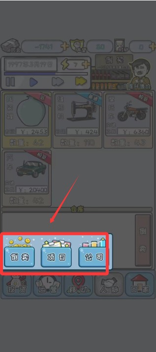 2、然后跟着教程走,教程结束以后,可以点击投资,选择赚钱的方式,一共有三种倒卖、项目以及公司。