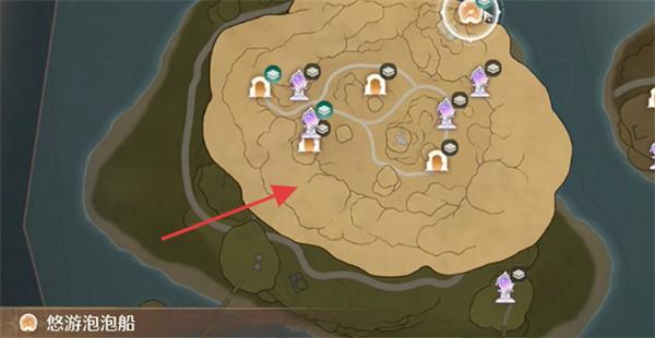 1、地图界面,展示【悠游泡泡船】观光区域(红箭头指向岛屿),含观光点位标识。