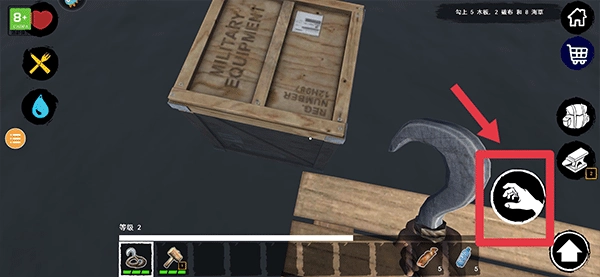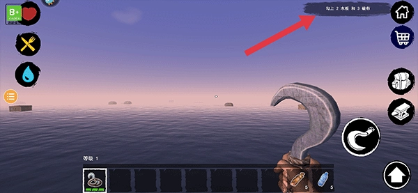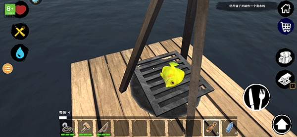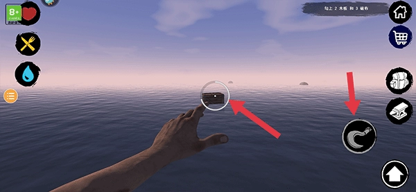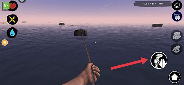 5、成功勾住物品后,再次点击钩子按键,把勾住的物品拽回木筏旁边。