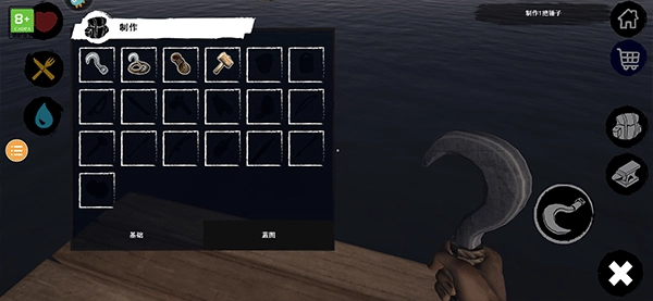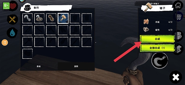 7、获取到资源后,就能打造锤子。只有拥有了锤子,玩家才能够扩建木筏,并且制造出各类生活工具。