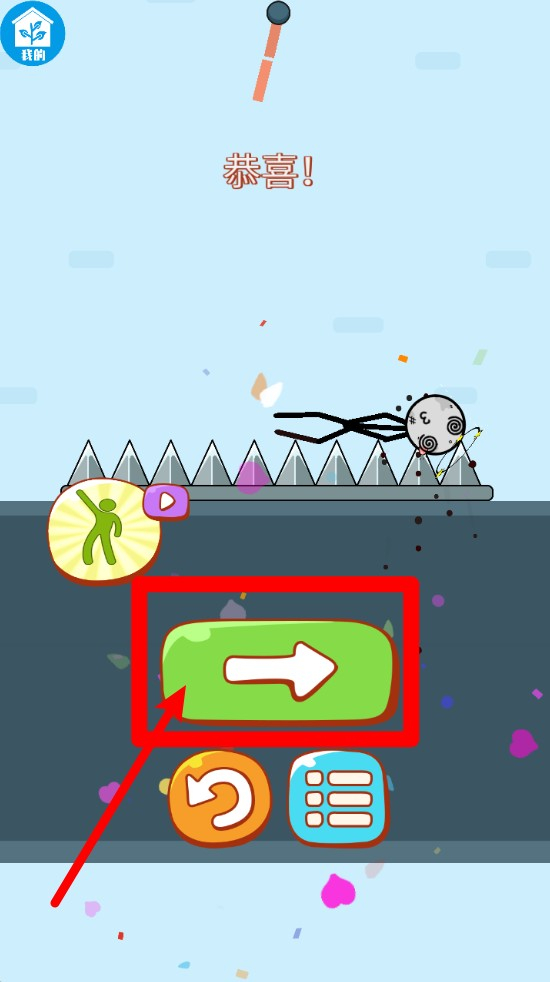 3. 通关后,系统会自动显示“恭喜”,此时只需点击绿色的右箭头按钮,就可以进入下一关继续游戏了。