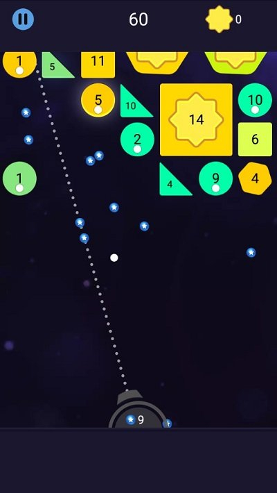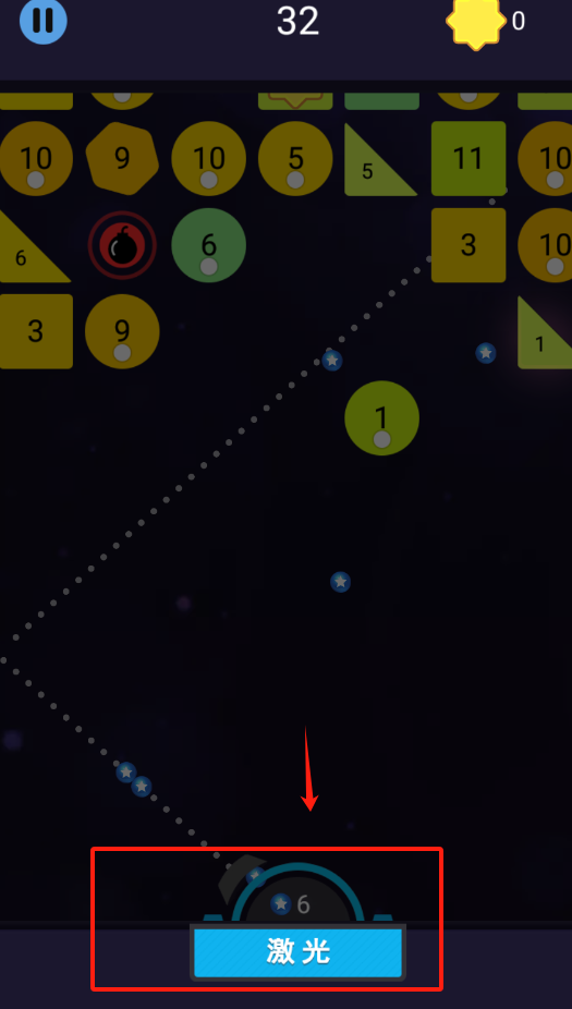 3、用手指滑动屏幕控制弹球方向,多撞带数字的球体,攒够30颗星星。