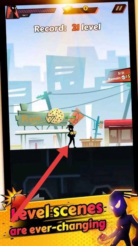 1、在不断变化的关卡场景中,操控火柴人角色,按照箭头指示的方向前进,应对城市环境中的各种挑战。