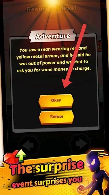 2、遇到奇遇事件(The-surprise-event-surprises-you)时,选择【Okey】,给穿着黄红色铠甲的人钱,触发剧情分支。