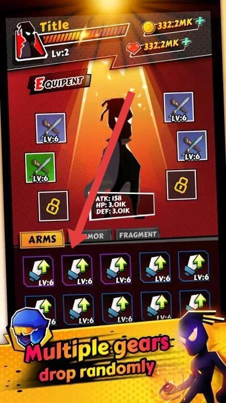 3、在装备界面,点击箭头所指的武器(等级:6),进行升级或更换,以提高“攻击力、生命值、防御力”,从而增强角色的战斗力。