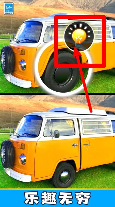 2.提示功能可在卡关时使用,点击灯泡按钮后将自动标出一个未找到的差异帮助继续闯关。