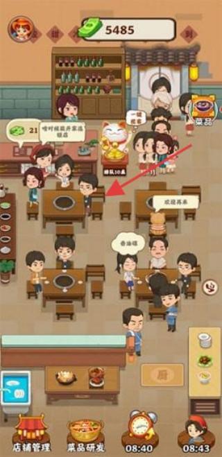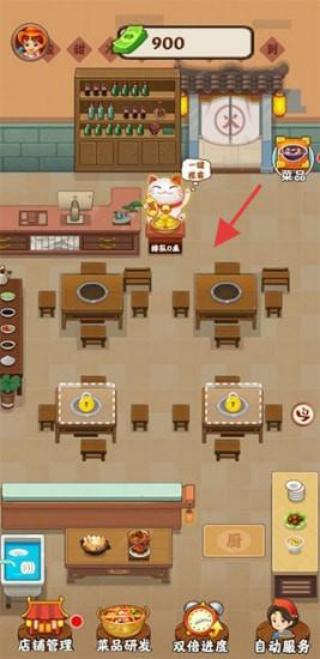 1、在店铺界面(红箭头),布置餐桌招财猫,提升环境,吸引顾客入座。