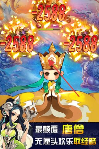 1、操控【唐僧】,搭配角色(如持杖女),利用技能(-2588伤害),体验“无厘头取经”,推进主线。