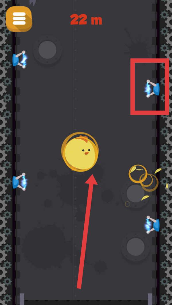 2、在游戏中,按照箭头的指引,点击屏幕使小鸡跳跃,收集金币,并避开两侧的电击装置,挑战更远的距离(目前记录为22米)。