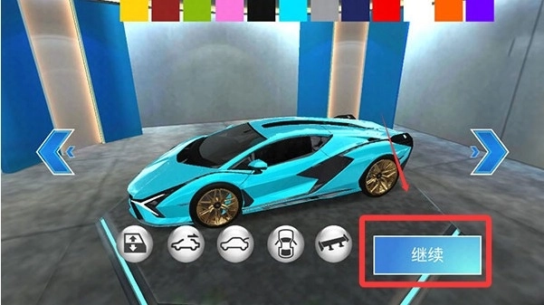 1、进入游戏后在车库当中选择好自己想要驾驶的车辆,然后点击继续。