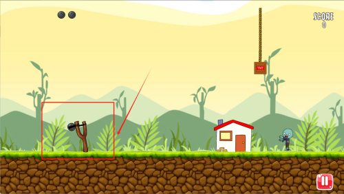 2、操作弹弓瞄准右侧悬挂的红色方块,拖动屏幕调整射击角度,利用抛物线原理避开房屋障碍,精准命中目标获取分数。