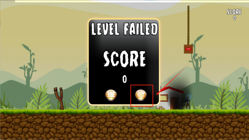 3、关卡失败后查看"SCORE 0"得分提示,点击红框标注的右侧TNT图标使用炸弹道具,可清除障碍物重新挑战当前关卡。