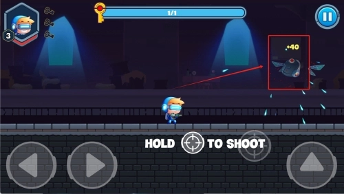 2、遇到敌人时,按住屏幕下方的“HOLD TO SHOOT”按钮进行瞄准,当准星对准红框内的目标后松开按钮射击,成功击败敌人可获得“+40”的分数奖励。