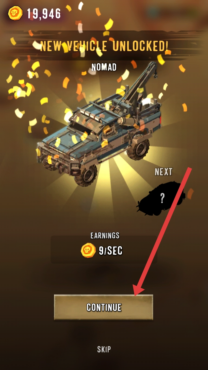 2、当成功解锁新车辆NOMAD后,点击“CONTINUE”按钮,以此确认解锁操作,并返回至游玩界面,随后继续开展合成操作。