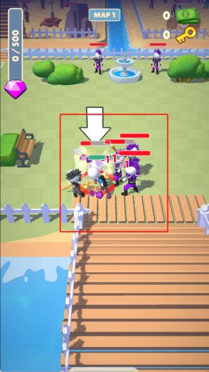 1、在初始场景中操控角色沿木桥前进,注意避开喷泉等障碍物,靠近头顶红条敌人后点击攻击键触发战斗,击败敌人可获取资源。