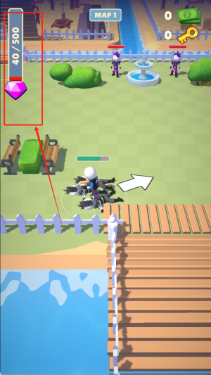 2、观察左上角资源数值40/500,按箭头指引方向移动角色,利用绿植作为掩体接近敌人,击败目标后收集掉落的金币和钥匙。