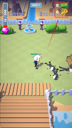 3、当角色打败黑衣敌人后,注意检查右上角红框内的金币数量。如果当前金币数为0,则需要继续战斗以获得更多金币。钥匙图标可能用于解锁特定区域或开启宝箱。