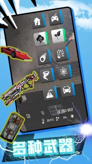 失控世界模拟器是一款以破坏和解压为主题的休闲益智游戏。玩家可以在虚拟城市中自由探索,运用多种武器和工具摧毁建筑物来释放压力。通过使用导弹、核弹、战机等装备完成破坏任务,并能借助自然现象提高效率。