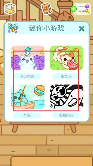 2、游戏中还设有四款萌萌的小游戏,可以不断获取金币,用来消磨时间也是极好的。