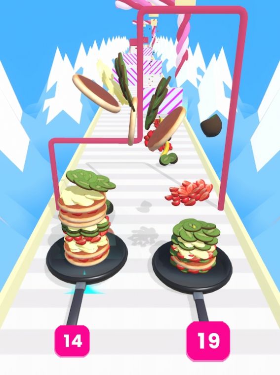 3、要是您撞上高耸的墙壁或者高低不一的大门,煎饼便会掉落。去收集各类成分,打造一座巨大的煎饼塔吧!