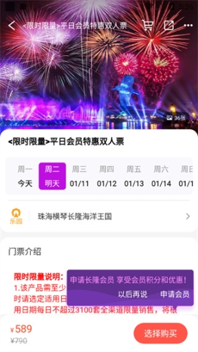 5、挑选完成后,小伙伴就可以直接下单购买门票,不过买之前可以试着申请会员后再购买,有惊喜的哦;