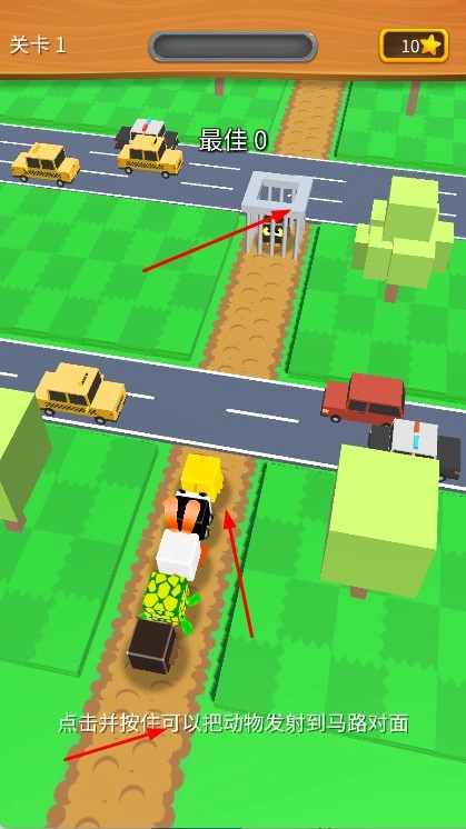 2、依照提示,点击并长按屏幕,就能将动物发射至马路对面。通过长按屏幕发射动物,使其穿越行驶着车辆的马路,避开汽车,最终抵达对面的笼子。