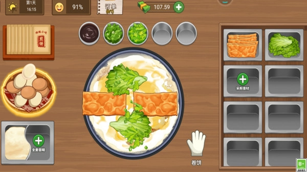2、最初的煎饼摊仅配备一个普通铁板与基础工具,玩家能够利用盈利所得资金对设备进行升级,升级后可提升制作效率,减少客人等待时间。
