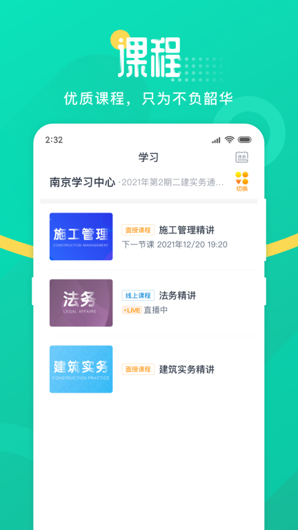 平台开设建筑工程、财会金融、职业资格、医药健康、技能提升、学历提升、公职类这7大类课程,课程配备各类班级与齐全的教辅资料。机构老师于后台为学生开课,学生入班后,能够观看课程、查看课件讲义,还可练习历年真题、模拟习题,翻阅冲刺宝典等。临近考试时,学生可观看直播课程,通过举手发言、弹幕评论的方式,与老师进行充分沟通,实现互动答疑。
