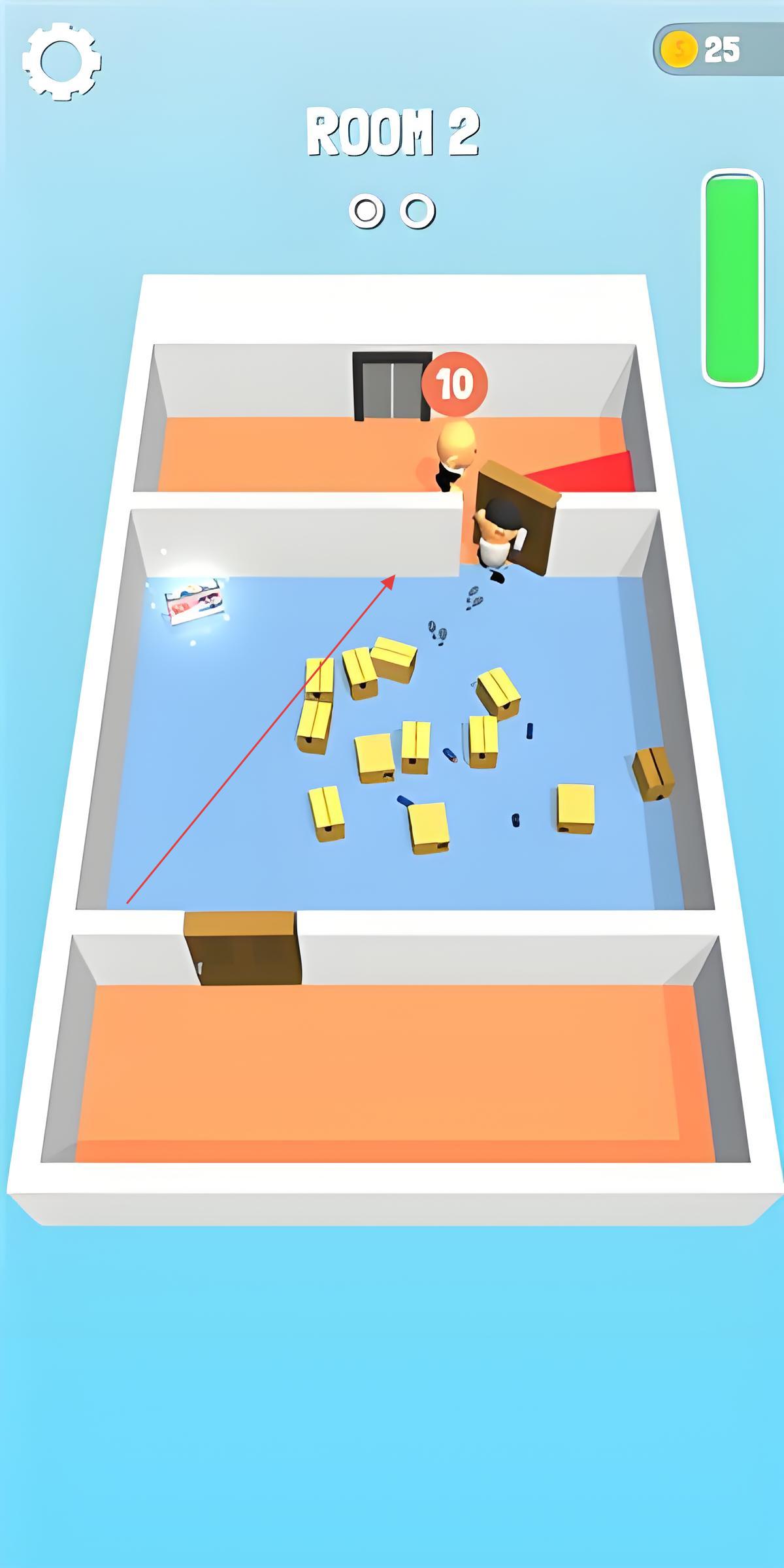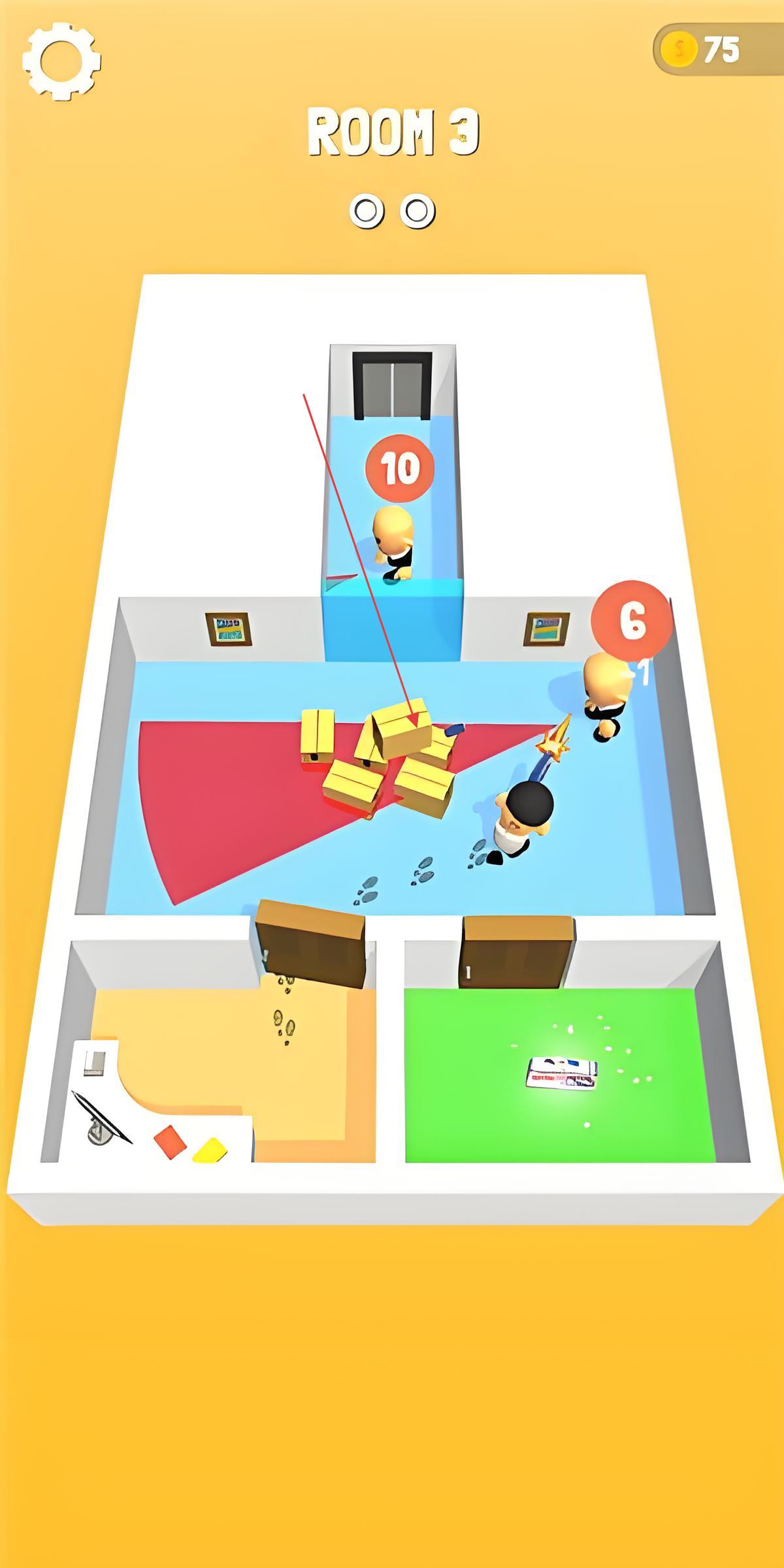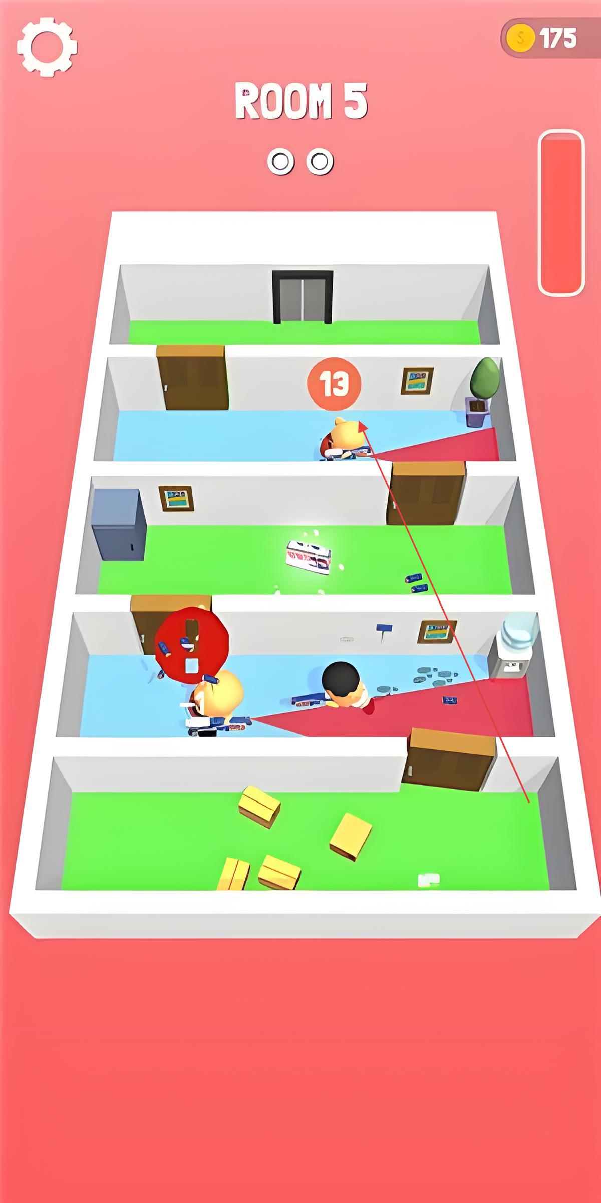 1进入游戏后,首先在武器库中挑选一把初始手枪。通过滑动屏幕来控制光头角色的移动,并点击屏幕右侧的按钮进行射击。初次挑战时,需要先熟悉房间内掩体的位置以及敌人的巡逻路径。