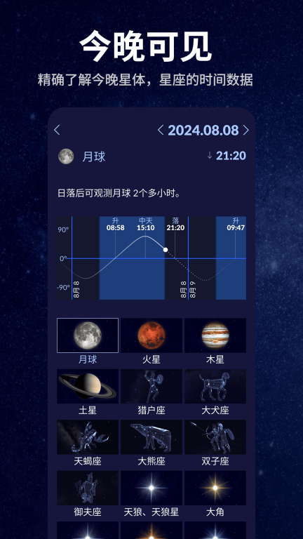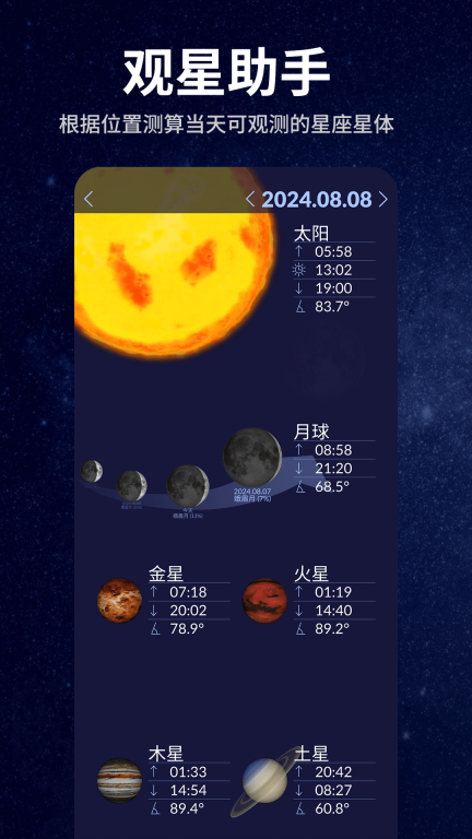 我们通过手机传感器来精确确定夜空中恒星、行星、星座、彗星、国际空间站、卫星、星团、星云以及流星雨等天体的准确位置。测星这项功能适用于带数字罗盘的设备。