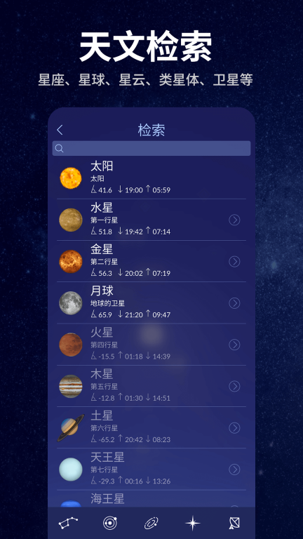 星空天文是一款精致的学习天学、天网和观测星星、太空的宇宙探索App,可以使您通过移动设备屏幕探索夜空星云。去成千上万的恒星、彗星、星座等天体进行不会忘记的旅行,是您趁手的观星台,您需要做的就是将星空天文app指向天空!