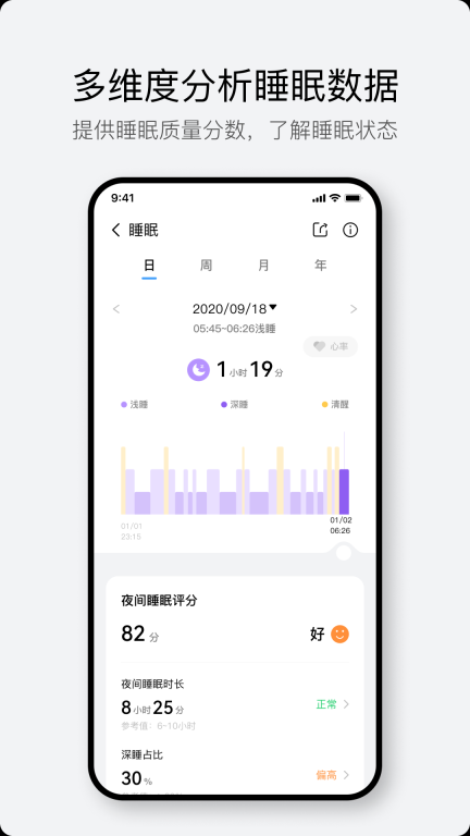 记录每晚的睡眠信息,通过分析睡眠中不同睡眠的占比情况来分析你的睡眠质量分数,并提供相应睡眠分析和建议。