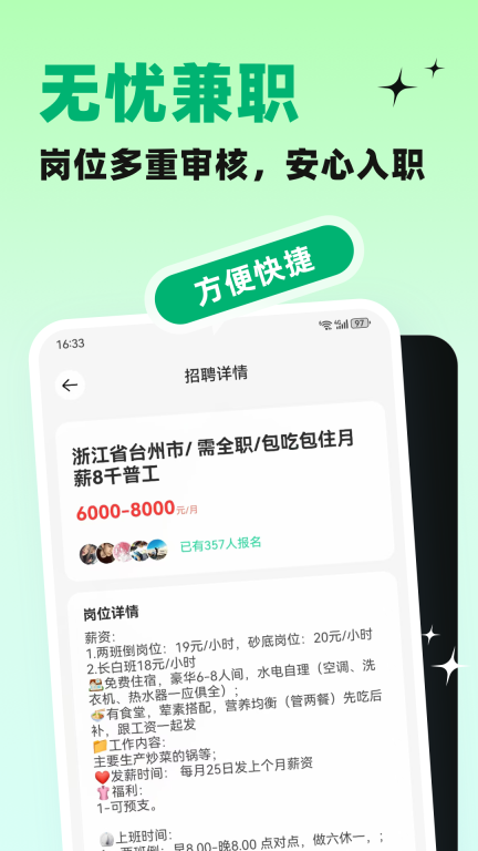 2、致力于为用户打造高效的兼职流程,无论是兼职信息的浏览,还是申请、报道等环节,均提供了快捷便利的服务。