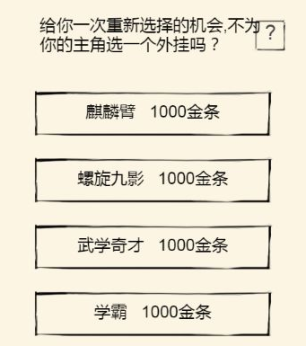 --【重新游戏】也就是俗称的上吊,通过吊死自杀的方式重新开始。要是你打算重新来过,可在初始房间拾取麻绳,然后前往平安镇西郊的大树处进行上吊自杀。 【基本武功等级会将部分潜能和银两返还至你的遗产中,同时身上的装备、金条以及坐骑也都会成为遗产。重新创建角色后,可在初始房间左边的宝箱中拾取这些遗产。 (请谨慎使用此功能,先天属性能够借助洗髓改变,武学方面的问题可通过轮回转生或者出师解决,容貌问题在进入顺天府后也能得到处理)】