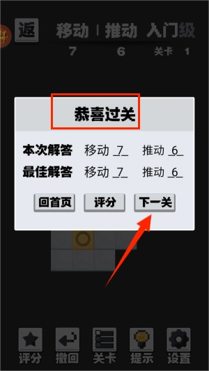 3、当你把所有的都推完,就能赢得游戏胜利,进而挑战下一关咯。而且,游戏会记录你推动的次数哟。