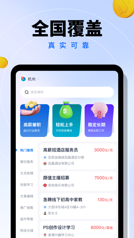 在线兼职岗位种类齐全,每日精选岗位、智能推荐同城兼职,帮助求职者轻松、快速找到满意的兼职岗位,提升生活质量。