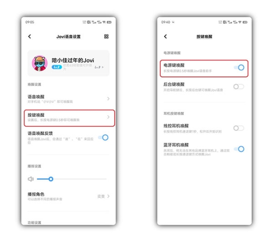 在按键唤醒设置页面,开启通过电源键唤醒功能,长按电源键0.5秒即可唤醒Jovi语音助手。