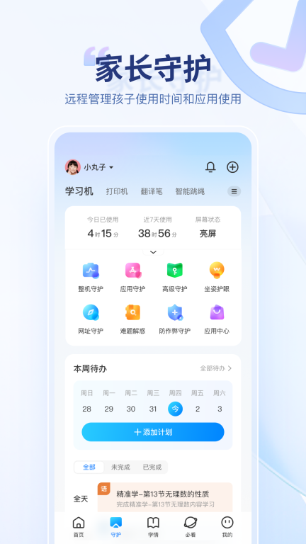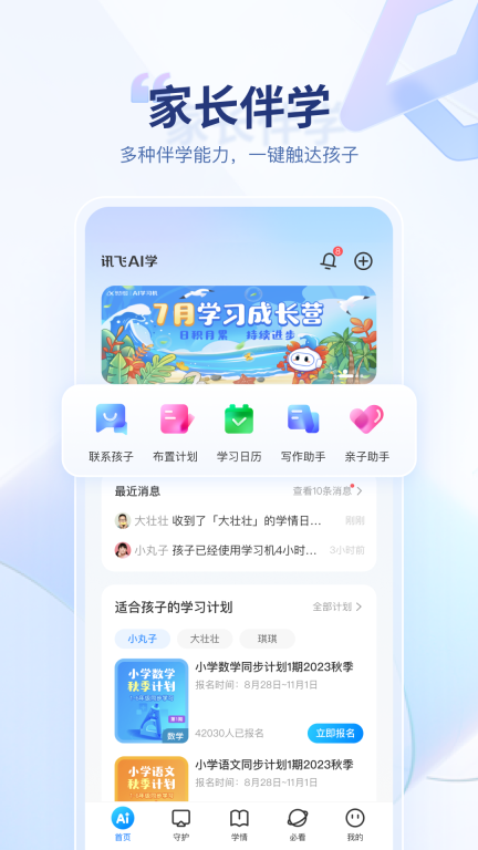 家长可以通过讯飞AI学App实时了解孩子使用讯飞学习机的学习动态、管控学习机的娱乐活动和使用时间、向孩子布置并批改作业。