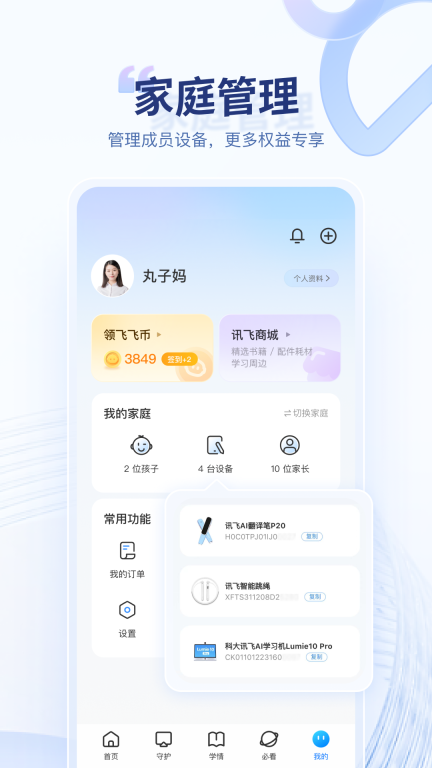 -我的:绑定并查看学习机设备、切换设备、解绑设备、寻求客服支持等。
