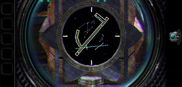 8、将硬币放入机关盒侧面的插槽中,旁边会开启一个圆形镜面,在这个镜面部分使用目镜。转动两个铜色的圆盘找到与所示轮廓相吻合的图案。得到盾牌(家族徽章)。