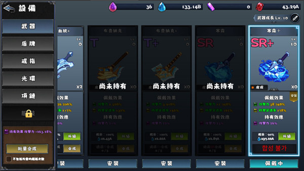 武器、盾牌、戒指抽33次都只有300宝石,其它的召唤都是比较贵的,这三个刚好影响基本的攻击、防御穿透率、体力、防御率、普攻伤害、攻击速度建议一开始不用犹豫,直接一路抽,把这三个设备都抽到SR+为止,大概100A以内就能把三个都抽到SR+。