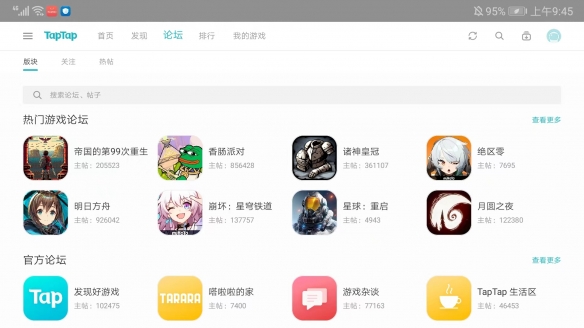 5、进入【论坛】界面,这里包括热门游戏论坛、官方论坛和个人论坛等不同的板块,玩家可以在这里交流心得、分享经验。