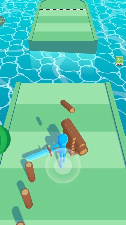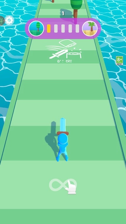 1. 蓝色小人手持宝剑进行跑酷,当看到伐树提示时,就挥动宝剑砍树,随后点击无穷符号,便可继续向前行进。