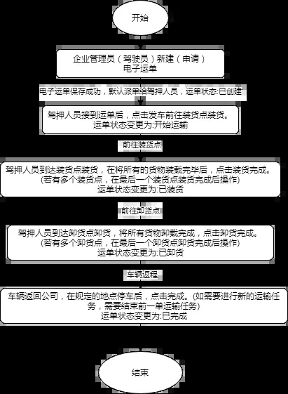 电子运单新增→司机发车(相关 驾驶 员)→运单已装货(相关驾驶员)→运单已卸货→“完成运输”(相关驾驶员),具体业务流程图如下: