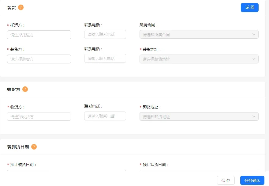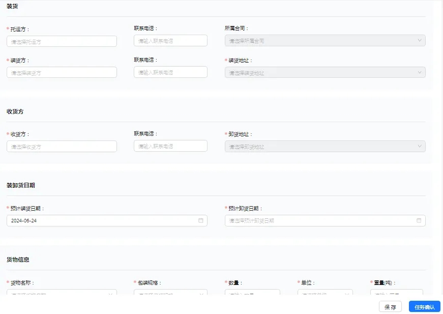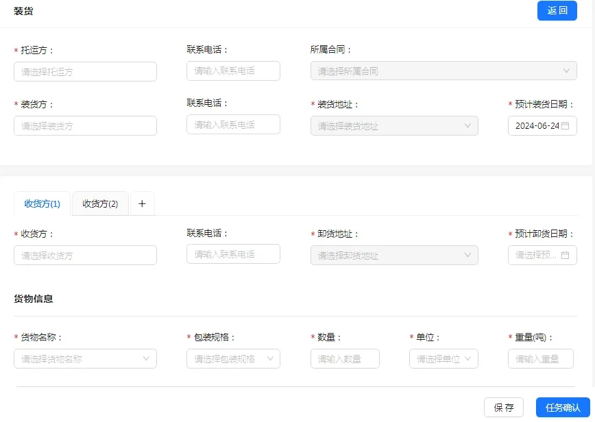 填好数据后通过点击最下面的任务确认按钮保存本次录入的运单(建单完成后默认派单至驾驶员)。