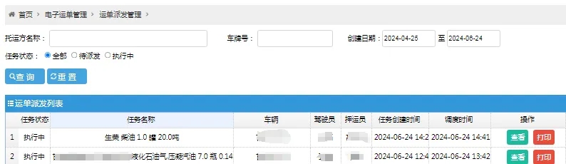 危货运输企业电子运单安全检查完成后,点击【电子运单管理】-【运单派发管理】页面列表中,进行运单派发工作。