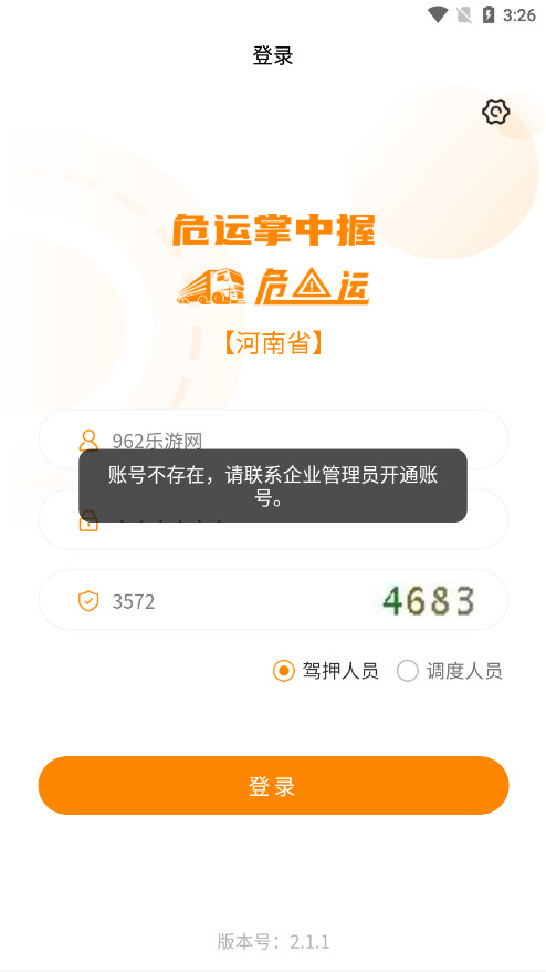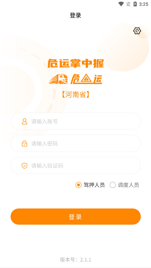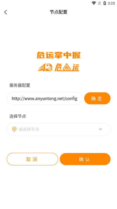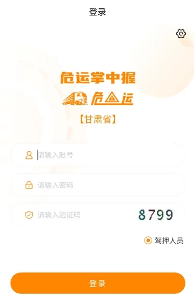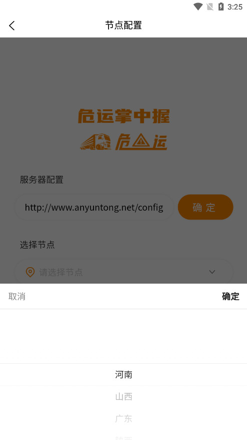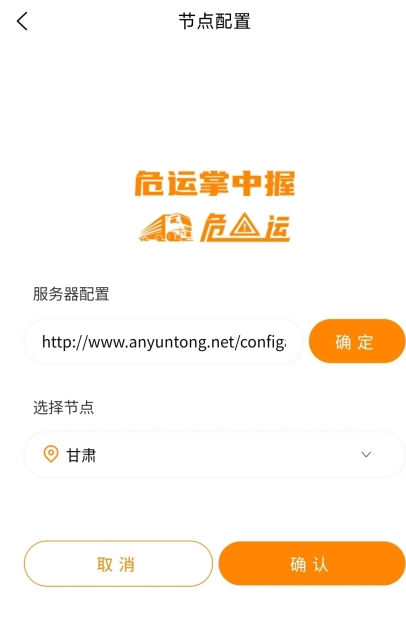 企业驾押人员登录【危企助手】APP(驾驶员帐号通过企业帐号添加),点击齿轮 图标 进行节点配置,只选择节点“甘肃”,点击确认。