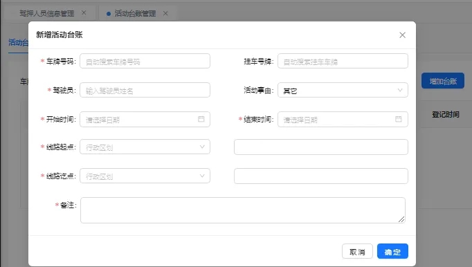 填写车辆信息,活动事由,线路启点,线路讫点,行驶的开始和预计结束时间,备注等信息。